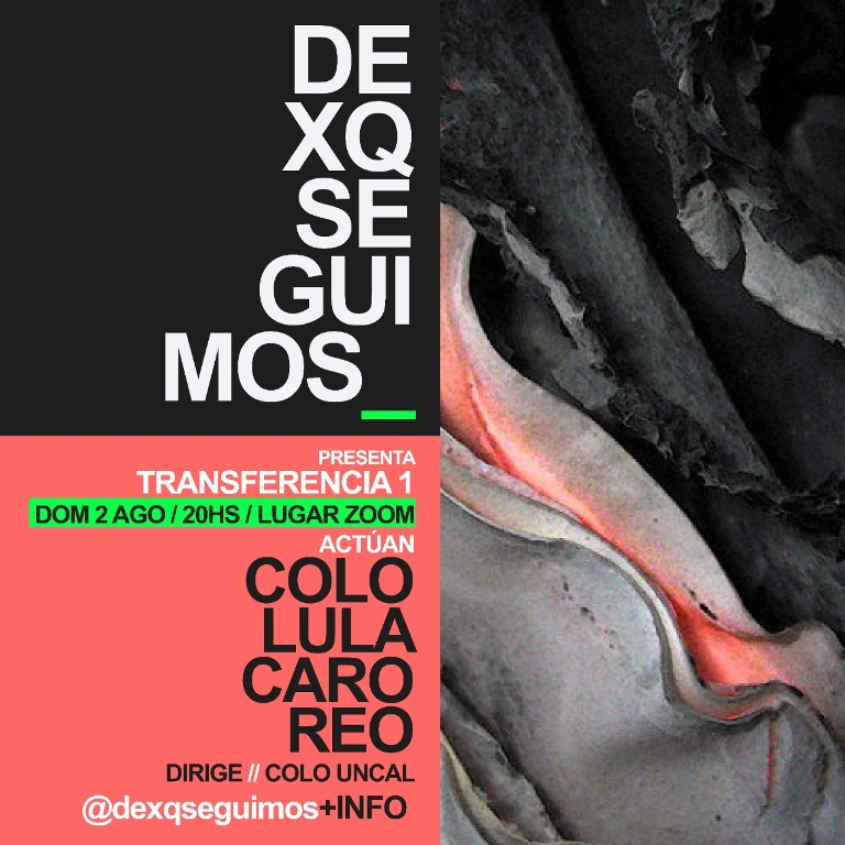 Este domingo 2 de agosto a las 20 horas vía la plataforma Zoom, podrá disfrutarse “Transferencia 1”, dirigida por Patricio Uncal, quien también actúa, en esta ocasión, junto a Carolina Ezcurra, Mariano Anido y Lucila Matteucci. El ingreso es con entrada a la gorra y es un vivo real. Es decir, solo se podrá ver a la hora indicada