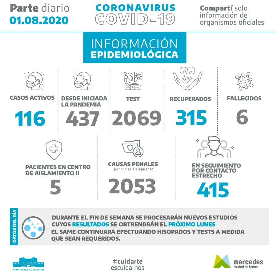 No obstante, desde el Hospital Blas L. Dubarry y el Municipio de Mercedes, brindaron un resumen de la situación epidemiológica: «En el día de la fecha 6 pacientes fueron dados de alta tras su recuperación médica arribando a un total de 315. Al día de la fecha tenemos 116 casos activos y 415 desde iniciada la pandemia. En seguimiento por contacto estrecho continúan a instancias del Centro de Teleseguimiento con 90 operadores socio sanitarios 441 mercedinos. En cuanto al Centro de Aislamiento Sanitario II con todas las normas socio sanitarias y un fuerte trabajo de Salud, Protección Civil, SAME, Seguridad, Desarrollo Social y Servicios Públicos tiene 5 pacientes alojados, aislados y monitoreados»