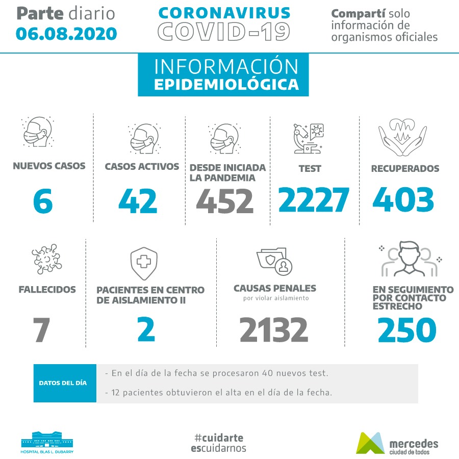 El cierre del día del informe epidemiológico de la ciudad, confirmó 6 casos positivos de covid-19 de los 40 test realizados este día jueves. Asimismo, informaron que 12 pacientes recibieron el alta al cumplir con los días de cuarentena obligatoria.