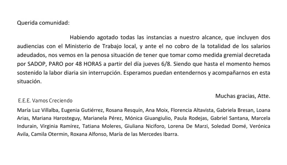 A través de una carta abierta a la comunidad, el grupo de docentes y trabajadores de las Escuela de Educación Especial «Vamos Creciendo» tomaron como medida gremial un paro por 48 horas a partir de este jueves 6 de agosto.