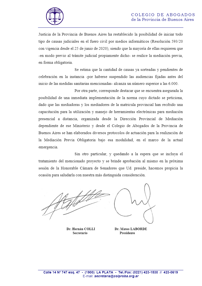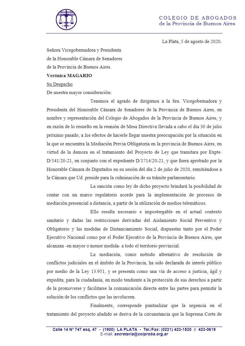 Los veinte Colegios Departamentales de Abogados que conforman el COLPROBA (Colegio de Abogados de la Provincia de Buenos Aires) solicitaron al Senado Bonaerense se incluya el tratamiento del proyecto de Mediación presencial a distancia y se brinde aprobación al mismo en la próxima sesión de la Cámara Alta. Con este objetivo, enviaron una carta a la presidenta del Senado Bonaerenses y Vicegobernadora, Verónica Magario.