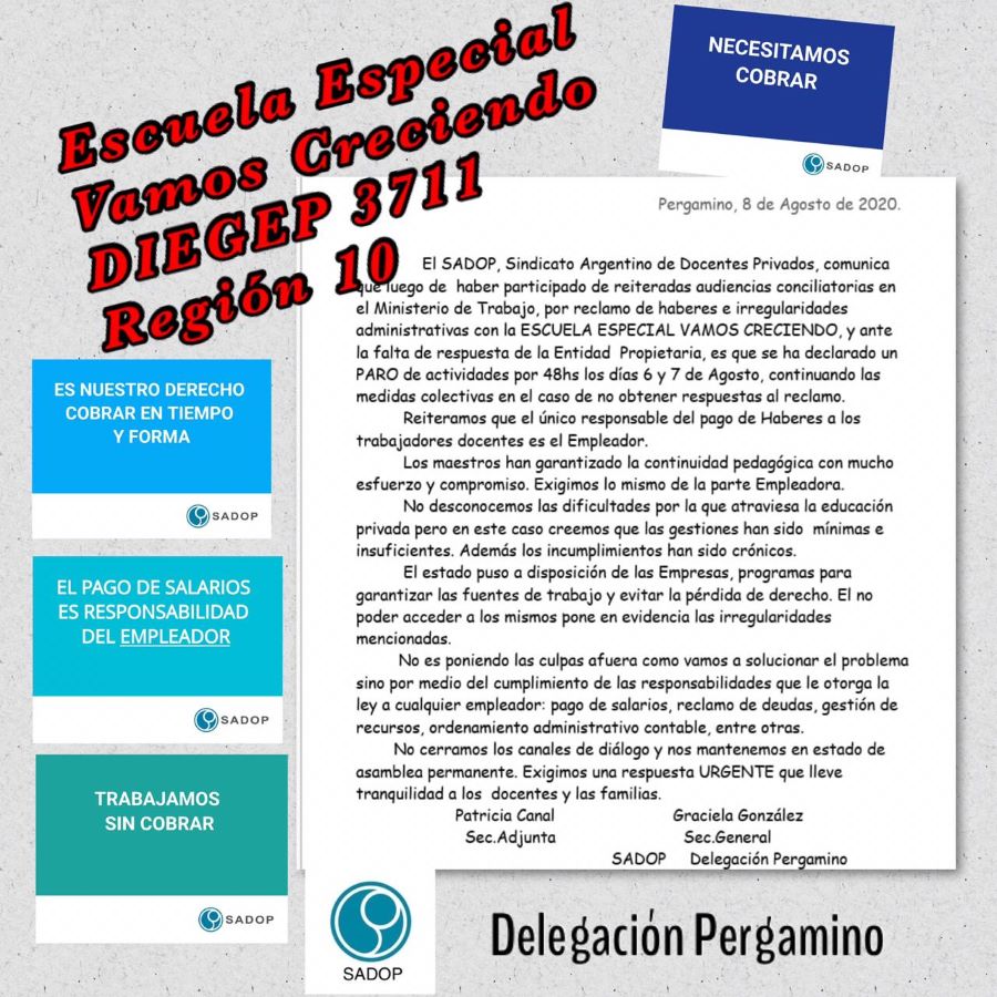 Las docentes de la Escuela Especial Vamos Creciendo extendieron por 72 horas más el paro de actividades. Con el acompañamiento del Sindicato de Docentes de instituciones de gestión privada, SADOP Pergamino, reclaman el salario en tiempo y forma.