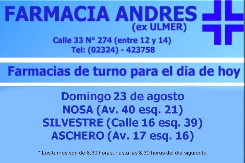 Farmacias de turno día domingo 23 de agosto 23 agosto, 2020Desde las 8:30 del día de hoy hasta la misma hora de mañana, las farmacias de turno son: Nosa, Silvestre y Ashero.Comparte esto: Haz clic para compartir en WhatsApp (Se abre en una ventana nueva) WhatsApp Haz clic para compartir en Telegram (Se abre en una ventana nueva) Telegram Haz clic para compartir en X (Se abre en una ventana nueva) X Haz clic para compartir en Facebook (Se abre en una ventana nueva) Facebook TE PUEDE INTERESARCOMENTARIOS Comentarios
