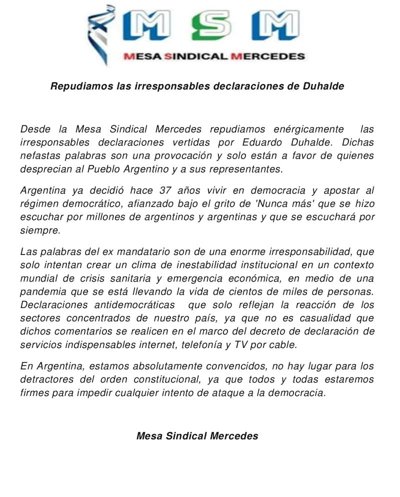 (Comunicado de la Mesa Sindical Mercedes) «Desde la Mesa Sindical Mercedes repudiamos enérgicamente las irresponsables declaraciones vertidas por Eduardo Duhalde. Dichas nefastas palabras son una provocación y solo están a favor de quienes desprecian al Pueblo Argentino y a sus representantes.