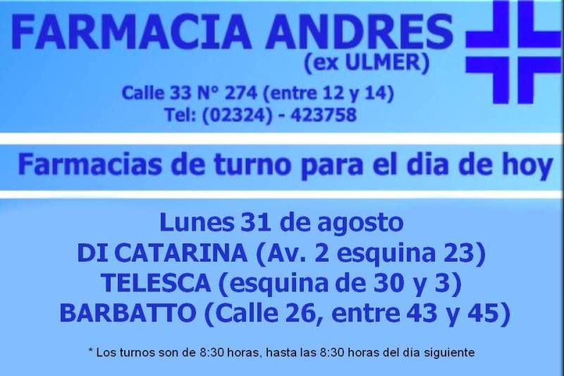 Desde las 8:30 del día de hoy hasta la misma hora de mañana, las farmacias de turno en Mercedes son: Dicatarina, Telesca y Barbatto