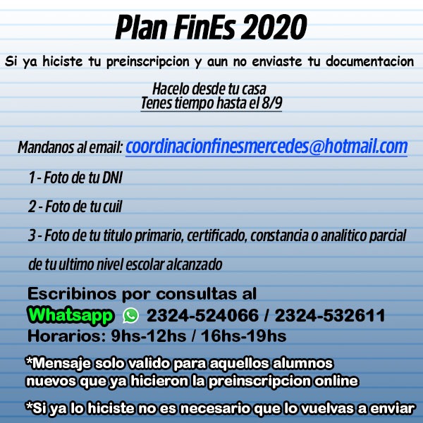 La Coordinación de FINES Mercedes e Inspección de Educación de Adultos informó que hasta el 8 de septiembre estará abierta la inscripción para aquellas personas que aún no se han inscriptos los meses previos y estén interesados en terminar el nivel secundario. Asimismo, solicitan que quiénes ya se inscribieron y deban enviar la documentación lo hagan antes de dicha fecha. Más información comunicarse con las vías establecidas.