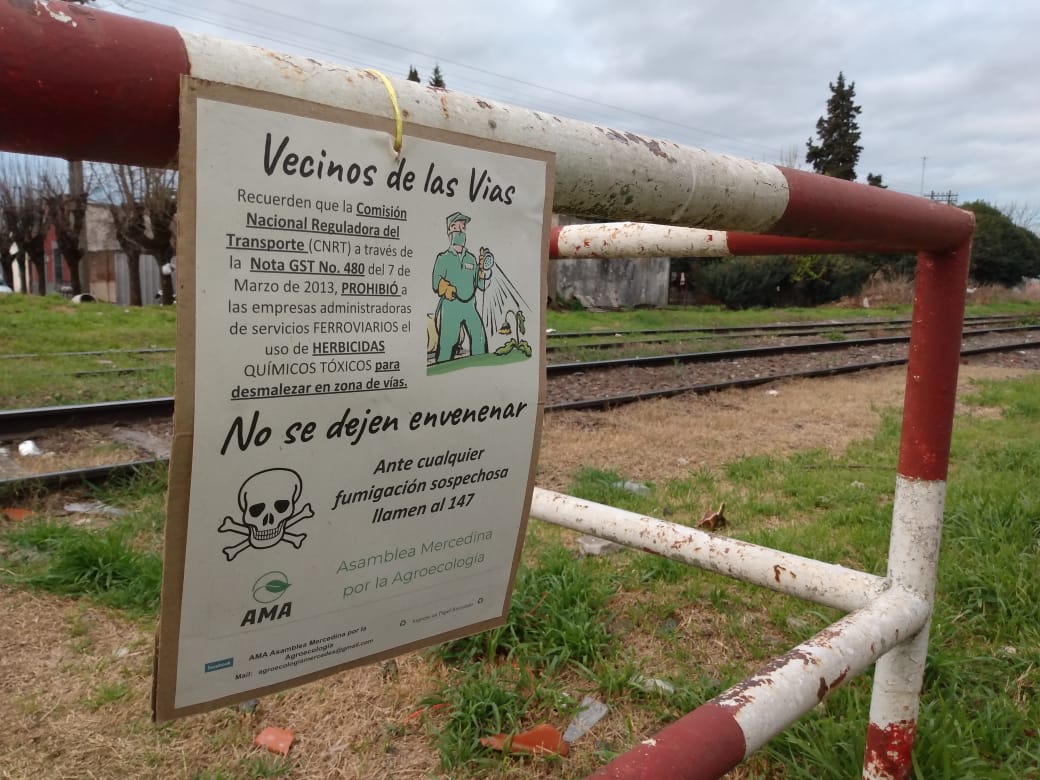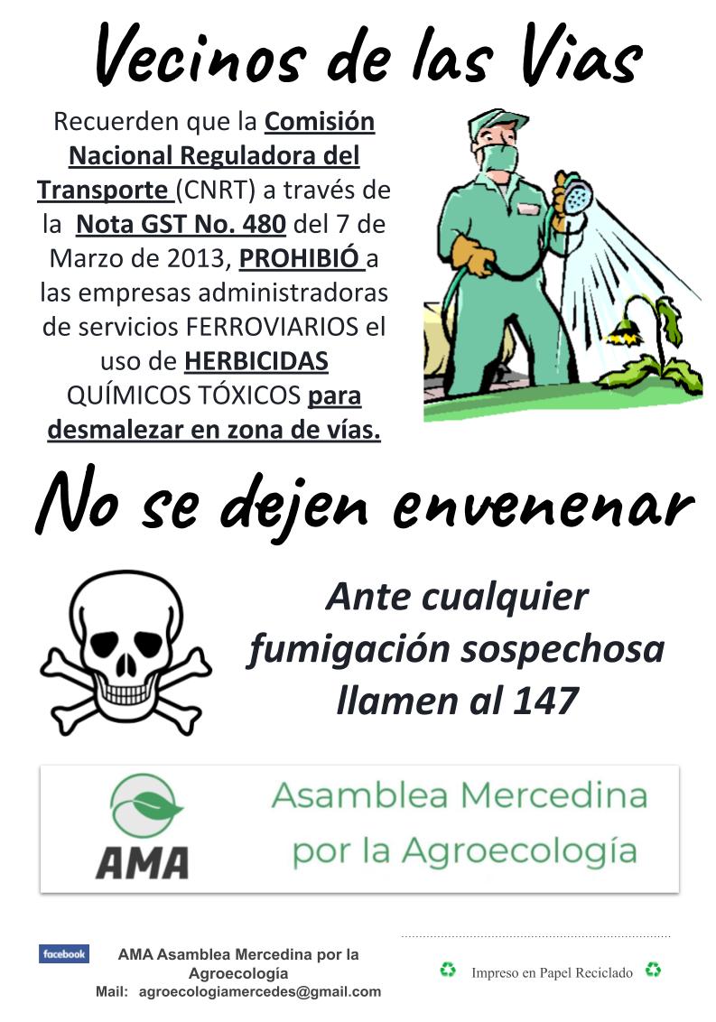 Durante esta semana la AMA, Asamblea Mercedina por la Agroecología, motivada por las consultas de algunos vecinos de la calle 10, está llevando a cabo una campaña de concientización e información sobre la fumigación ilegal que realizan empresas tercerizadas en tareas de desmalezado de vías férreas.
