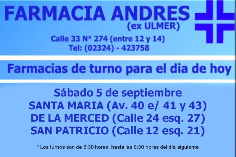 Desde las 8:30 del día de hoy hasta la misma hora de mañana, las farmacias de turno en Mercedes son: Santa María, De La Merced y San Patricio