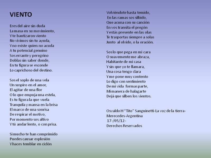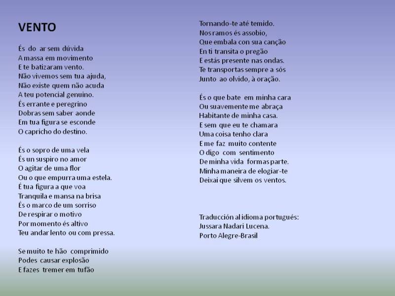 Nuevamente el cantautor y poeta mercedino, Osvaldo «Tito» Sanguinetti es traducido en portugués para ser publicado en Brasil. Jussara Nadari Lucena volvió a elegir un texto de Tito para difundir la literatura poética argentina. El poema se titula «Viento» y fue escrito y publicado por Sanguinetti en 2012.