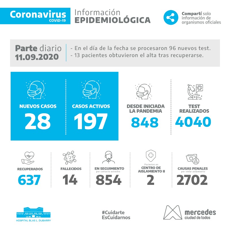 Al día de la fecha tenemos 197 casos activos y 848 desde iniciada la pandemia con 637 pacientes recuperados del virus.