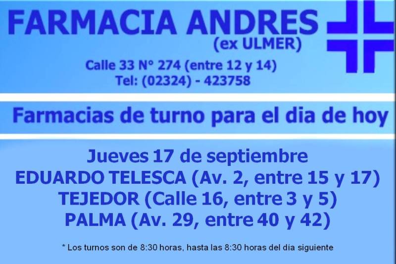Desde las 8:30 del día de hoy hasta mañana la misma hora, las farmacias de turno en Mercedes son: Eduardo Telesca, Tejedor y Palma