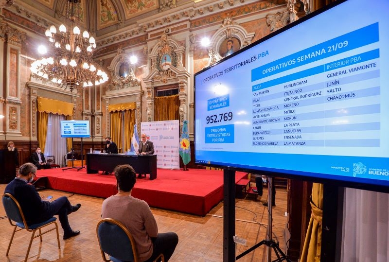 Desde el Salón Dorado de la Gobernación, el ministro Gollan destacó que en las últimas tres semanas se registra un descenso en el promedio de casos registrados en el Área Metropolitana de Buenos Aires (AMBA), aunque el interior de la Provincia sigue mostrando un aumento sostenido y representa ya el 20% de los contagios. En el AMBA, en la semana del 24 al 30 de agosto hubo unos 35.000 casos, mientras que la semana pasada la cifra se situó en algo más de 24.000. Los tiempos de duplicación de la cantidad de casos también han aumentado para el AMBA, acercándose a los 50 días, mientras que en el interior están por debajo de los 20, lo cual representa una aceleración de la circulación de la enfermedad. El Ministro también señaló el mejoramiento en las cifras de ingresos y egresos hospitalarios, con un descenso sostenido de la ocupación de camas tanto de terapia intensiva como intermedia en el AMBA.