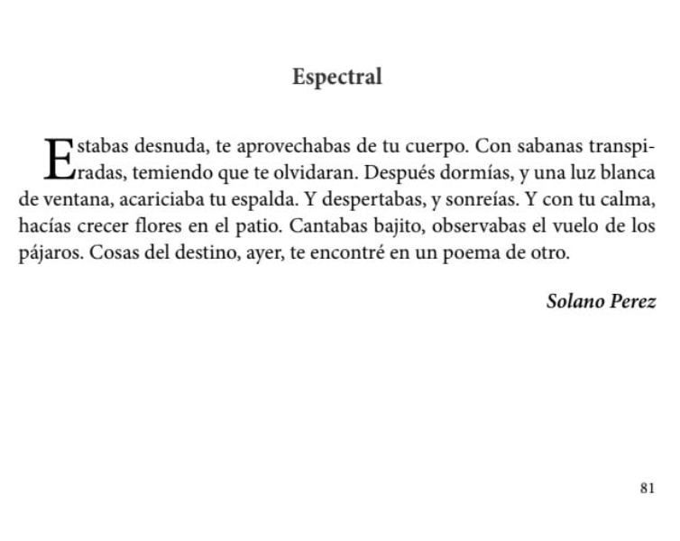 Desde sus perfiles en redes sociales el artista plástico y escritor mercedino Solano Pérez anunció que fue seleccionado en el concurso “Homenaje de autores argentinos a David Lagmanovich”. Su microrrelato “Espectral” está publicado en la página 81 del libro editado por Editorial Martín de Mar del Plata.
