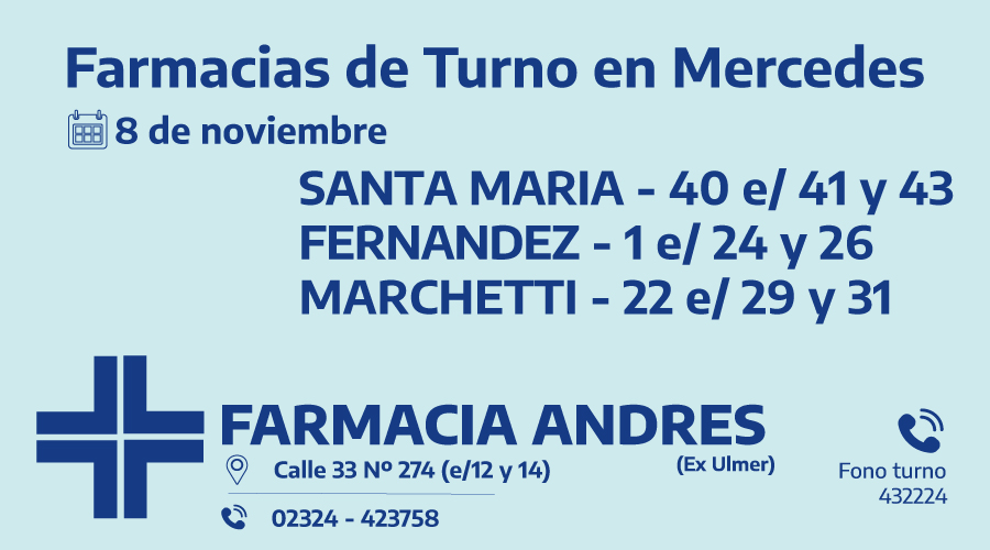 Desde la hora 8:30 del día de hoy, hasta la misma hora de mañana las farmacias de turno en Mercedes son: Santa María, Fernández y Marchetti.
