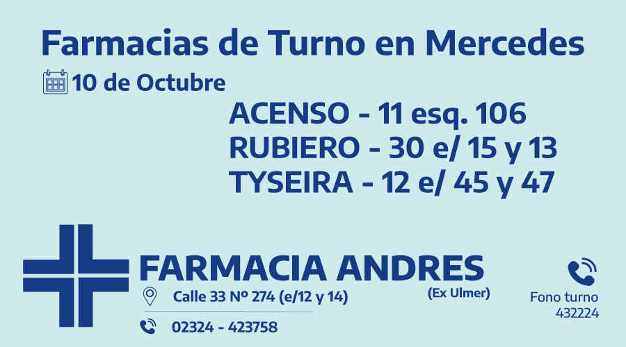 Desde la hora 8:30 del día de hoy hasta la misma hora de mañana, las farmacias de turno en Mercedes son: Acenso, Rubiero y Tyseira.