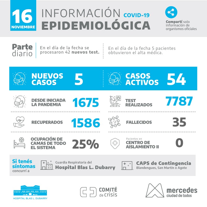 Al día de la fecha tenemos 54 casos activos. Por su parte 1675 casos se registraron desde iniciada la pandemia con 1586 pacientes recuperados del virus. 5 pacientes obtuvieron el alta médica en el día de la fecha.