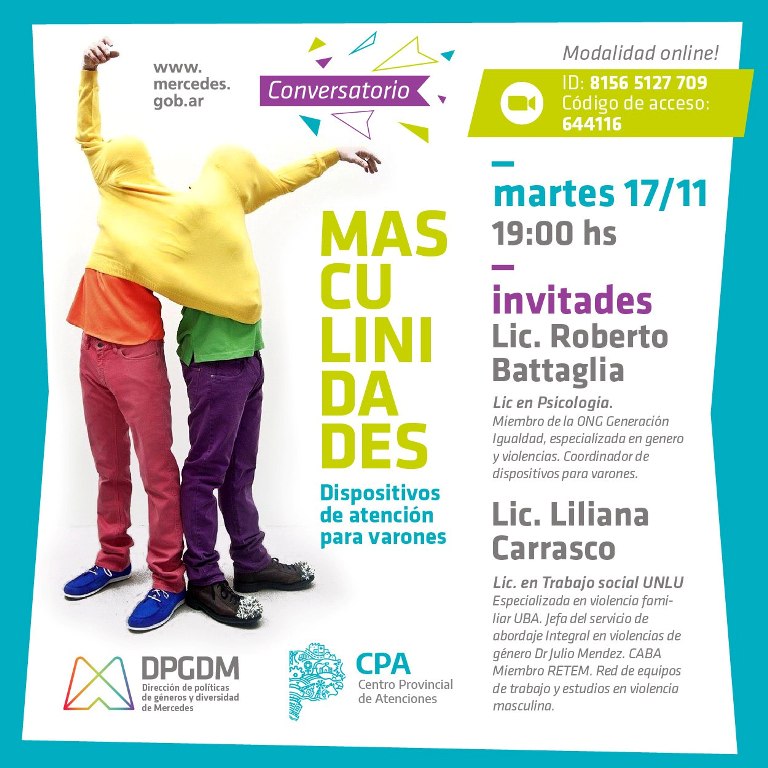 La Dirección de Políticas de Géneros y Diversidad de Mercedes (DPGDM) junto al Centro Provincial de Atenciones (CPA) invitan a la comunidad a una charla debate poniendo la atención en las «Masculinidades». La misma se realizará vía Zoom, este martes 17 a las 19:00 horas.
