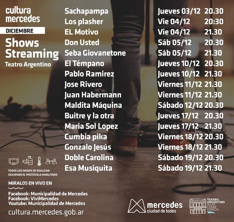 Desde la Dirección de Cultura Municipal anunciaron el cronograma de espectáculos musicales a transmitirse vía straming. Durante noviembre y diciembre, las noches de jueves, viernes o sábado, se podrá disfrutar desde la casa, la música de bandas y solistas de Mercedes que actuarán desde el Teatro Argentino.