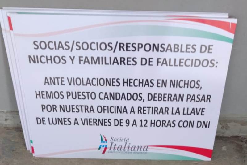A través de carteles colocados en las puertas de sus panteones del Cementerio Municipal, la Sociedad Italiana de Mercedes informó que debió cerrar dichos espacios con candados ya que en los últimos meses se producen «violaciones» en los nichos. La institución solicita a los socios que deseen visitar a sus familiares fallecidos, retiren las llaves previamente por la sede.