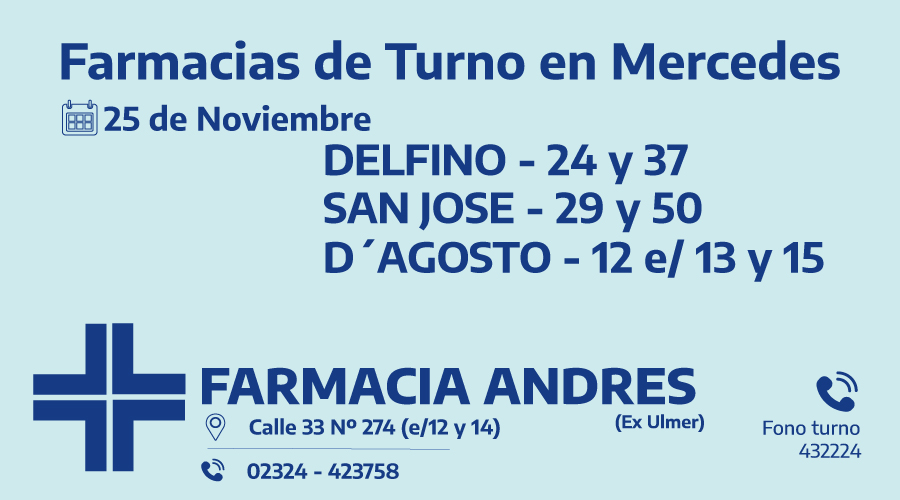 Desde las 8:30 del día de hoy, hasta la misma hora de mañana, las farmacias de turno en Mercedes son: Delfino, San José y D’Agosto.
