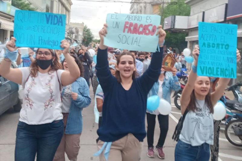 Detrás de una gran bandera celeste con la inscripción «Marcha por la Vida» la columna reunida caminó por las calles céntricas acompañados de bocinazos y cánticos. También pegaron carteles en árboles y estructura céntricas que dicen «Sr. Presidente: No insista más ¡Los niños por nacer, no quieren morir!» acompañadas es imágenes de bebés de corta edad.