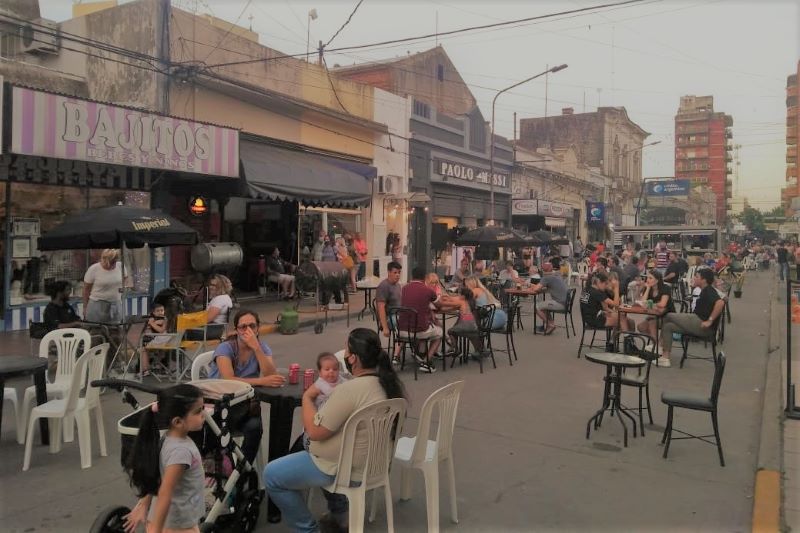 Los foodtrucks y confiterías con sillas y mesas en las calles hicieron más ameno el paseo y las compras, mientras varios clientes hacían cola en las puertas de los comercios a la espera del turno para ingresar compliendo con los protocolos.