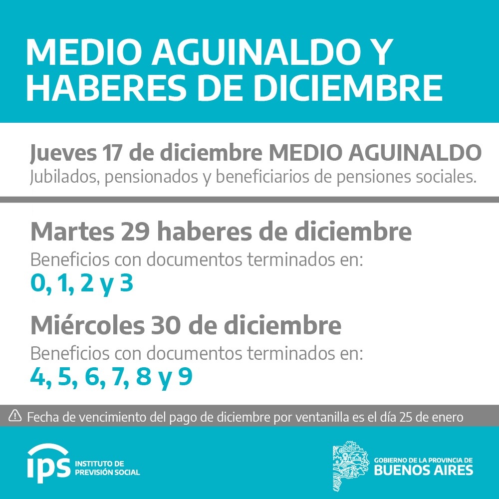 El Instituto de Previsión Social de la Provincia de Buenos Aires informa que todos los beneficiarios percibirán la segunda parte del Sueldo Anual Complementario (aguinaldo) a partir del jueves 17 de diciembre, y los haberes entre el martes 29 y el miércoles 30 del corriente mes.