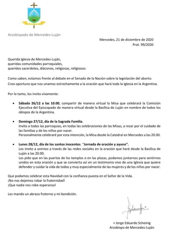 A partir de una convocatoria del Arzobispo de Mercedes-Luján, Monseñor Jorge Eduardo Scheinig, a lo largo de tres días la iglesia católica de la región llevará adelante tres días de oración sumándose a la propuesta de la Iglesia de todo el país. «Estamos frente al debate en el Senado de la Nación sobre la legislación del aborto. Creo oportuno que nos unamos estrechamente a la oración que hará toda la Iglesia en la Argentina», expresa el Arzobispo.