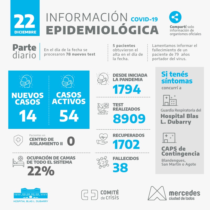 El informe sanitario enviado por las autoridades sanitarias de Mercedes confirma el fallecimiento de un paciente de 79 años portador del virus SARS-Cov2, llegando a 38 las personas confirmadas que fallecieron con el virus desde marzo a la fecha. Además sumaron 14 nuevos positivos entre los 78 test realizados. Asimismo, con 5 pacientes dados de alta, los casos activos son 54.