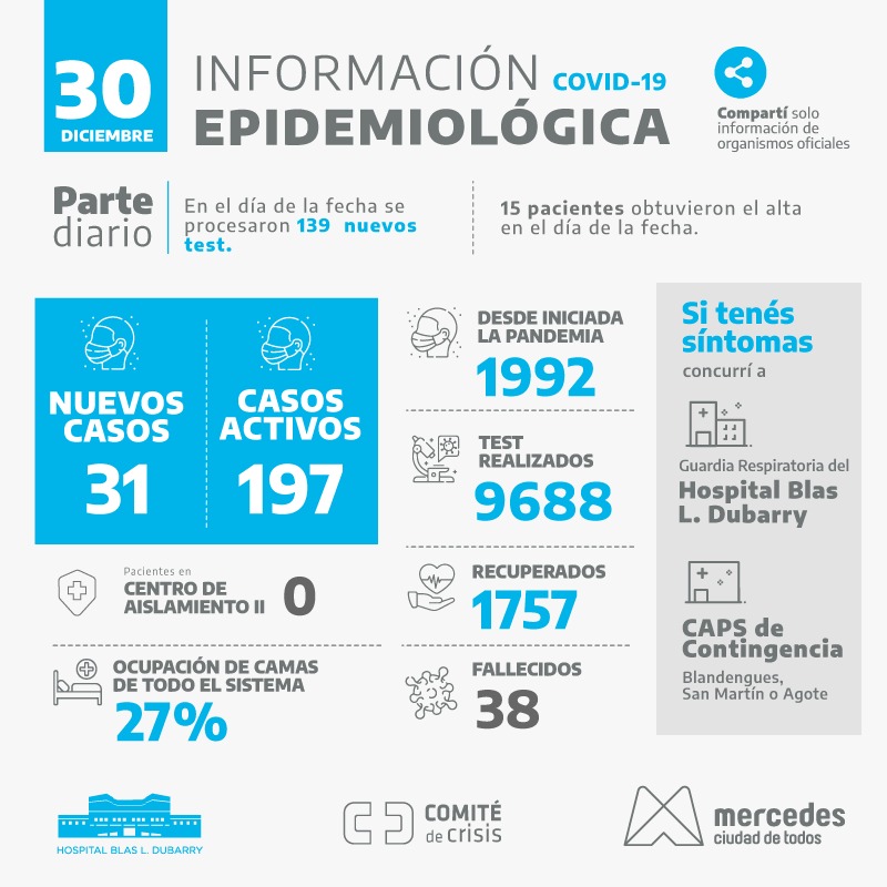 La información epidemiológica de Mercedes da cuenta de 31 casos positivos nuevos confirmados entre los 139 análisis realizados por el Laboratorio de Virología. Asimismo, informan que 15 pacienes fueron dados de alta en el día de la fecha. Desde Nación informaron este miércoles que durante las últimas 24 horas se registraron 145 muertes y 11.765 nuevos casos positivos de COVID-19