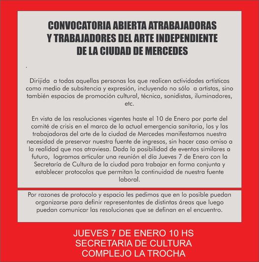A través de una convocatoria abierta y divulgada por referentes del sector artístico de Mercedes, invitan a «trabajadoras y trabajadores del arte independiente» a ser parte de una reunion que mantendrán con la Dirección de Cultura. La invitación es para el jueves 7 de enero, 10 horas, en la oficina del área cultural en el Centro Cultural La Trocha.