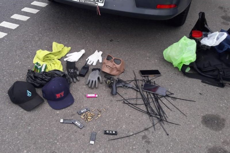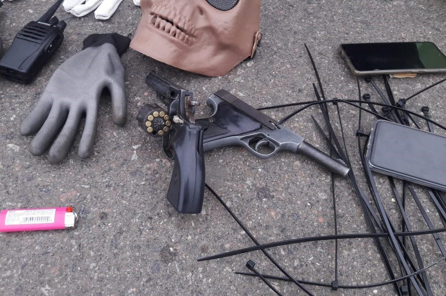 En el operativo de rutina de la policía de seguridad vial de San Andrés de Giles interceptaron un Renault Logan de color gris oscuro con tres ocupantes masculinos. Al requisar el vehículo se detecta en el baúl una mochila que contenía un revolver y una pistola, ambos calibre 22 largo, municiones, precintos plásticos, máscaras, guantes y un handy.