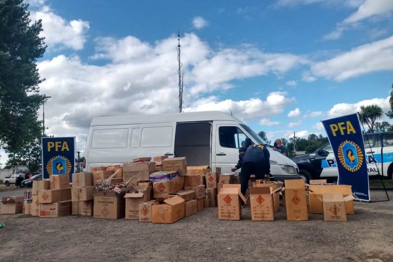 Posteriormente y en la misma intersección se detuvo la marcha de un vehículo Mercedes Benz Sprinter, se identificó al conductor, siendo este un masculino mayor de edad, oriundo de la localidad de Hurlingham, pudiendo constatar que en el interior del utilitario, transportaba cajas de cartón, en las que en su interior contenían gran cantidad de fuegos artificiales (pirotecnia) de todo tipo y modelo, de origen extranjero, al solicitarle la documentación advierten que no posee ningún tipo de factura o ticket que avale el ingreso de la mercadería a nuestro país, con un valor estimado en el mercado de 3.000.000 de pesos.