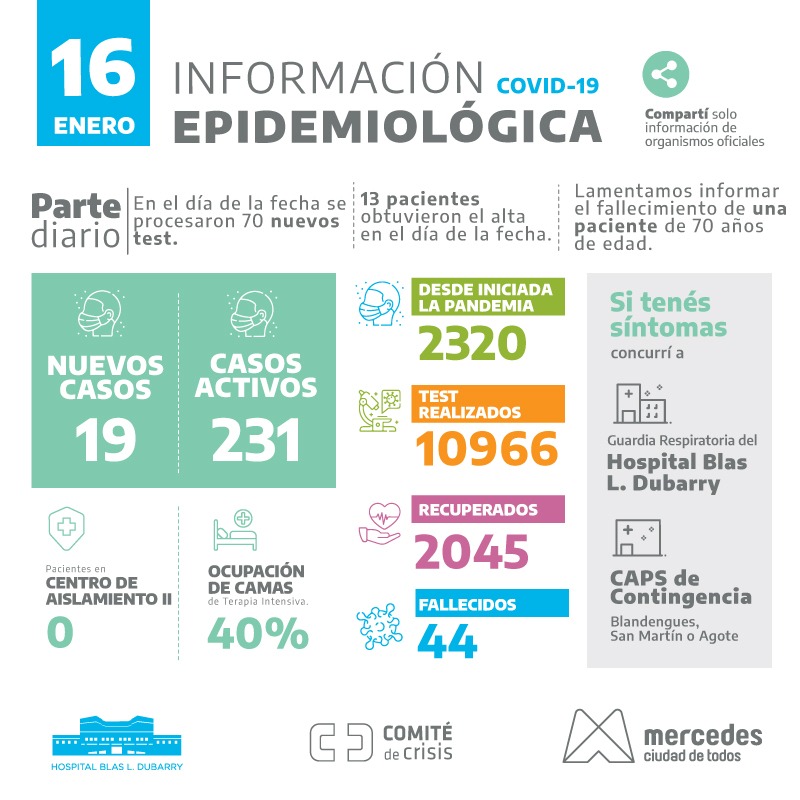 El parte diario oficial de Mercedes confirma el fallecimienti de una mujer de 70 años con el virus Sars-cov2 que produce el covid-19. Además, dan cuenta de 19 casos positivos entre los 70 análisis realizados en la fecha. Asimismo, informan que trece personas obtuvieron el alta.