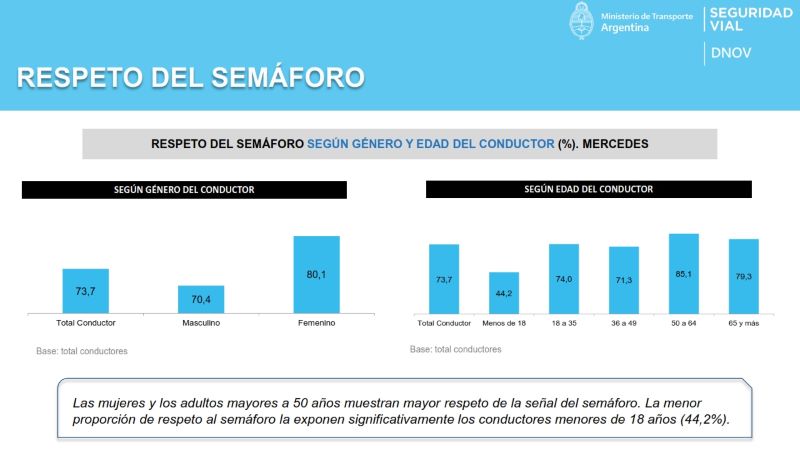 - El respeto del semáforo alcanza al 73,7% de los vehículos observados, siendo las mujeres y los adultos, especialmente los mayores de 50 años, quienes más respetan las señales. Entre los conductores menores de 18 años el respeto del semáforo es de apenas 44,2%, muy por debajo de la media del municipio.