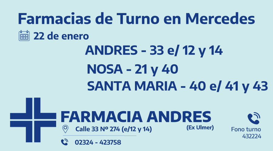 Desde las 8:30 del día de hoy hasta la misma hora de mañana las farmacias de turno en Mercedes son: Andrés, Nosa y Santa María.