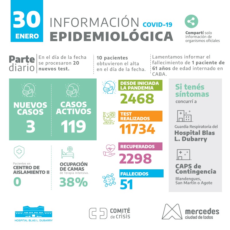 El parte con la información epidemiológica informa el fallecimiento de un hombre de 61 años que estaba internado con el virus SARS-Cov2 en la ciudad de Buenos Aires. Pero además, comunica el resultado positivo de tres hisopados entre los 20 análisis procesados en el día de la fecha y el alta de diez pacientes de acuerdo a los protocolos vigentes.