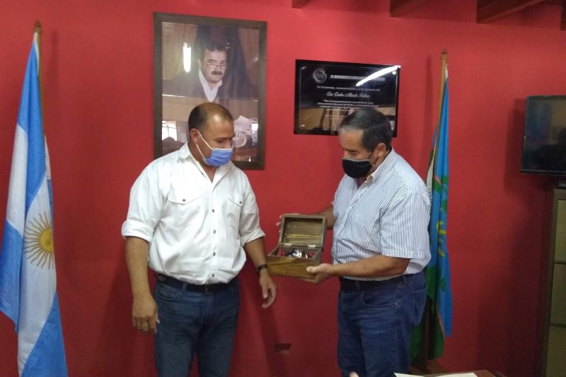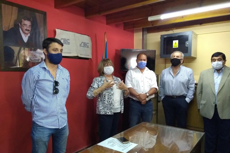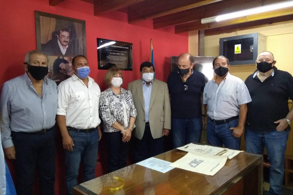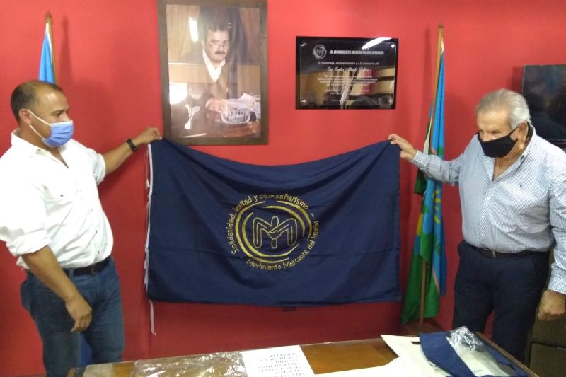 El actual Secretario General del Sindicato de Empleados de Comercio Pedro Gómez, junto a Liliana y a Luciano descubrieron la placa entregada desde la Federación para luego, la dirigencia de FAECYS entregar bandera, un mate como símbolo de amistad y un cuadro que representa al Movimiento Mercantil del Interior
