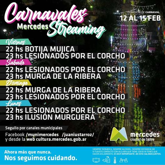 Por otra parte, la Dirección de Cultura del Municipio de Mercedes recordó que los corsos este año serán «simbólicos» y se transmitirán por las redes sociales vía streaming. «Proponemos que los carnavales los festejen desde casa. Cada noche de carnaval, desde los canales oficiales y la web oficial de cultura.mercedes.gob.ar podrá verse la performance de las atracciones y entrevistas», agregó Capaccio para luego recordar la agenda propuesta para que los vecinos sigan los carnavales 2021 desde la pantalla del celular, o una computadora.