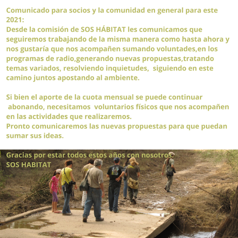 La Asociación Civil S.O.S. Hábitat comunica a la sociedad los proyectos y propuestas para el año recientemente iniciado. Entre las ideas, anticiparon que llevarán adelante caminatas bajo la luz de la luna llena, bicicleteadas guiadas a los lugares de patrimonio natural, y charlas y talleres con productores locales e invitados, entre otras actividades que están programando para los diez meses siguientes.
