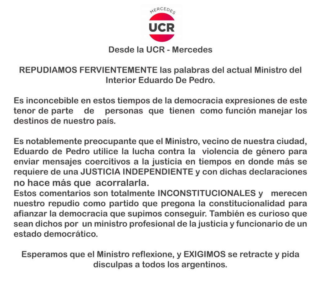 Desde la Unión Cívica Radical de Mercedes, en especial de las mujeres del centenario político, respudiaron los dichos del Ministro del Interior que «utilizó la lucha contra la violencia de género para enviar mensajes coercitivos a la justicia».