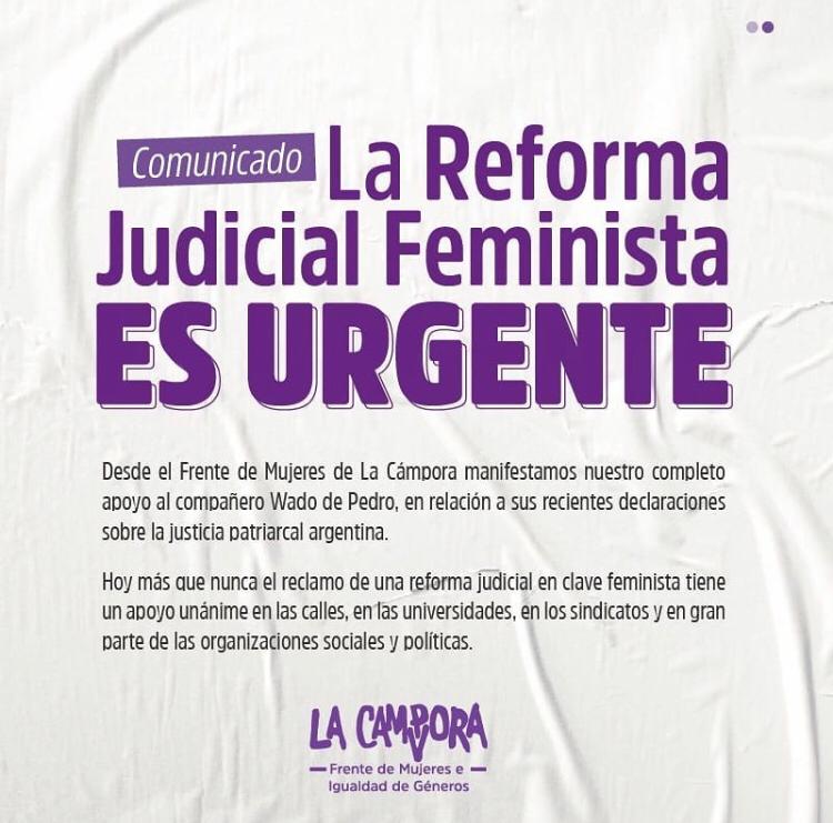 Desde el Frente de Mujeres de La Campora Mercedes manifestamos nuestro completo apoyo al compañero Wado de Pedro, en relación a sus recientes declaraciones sobre la justicia patriarcal argentina.