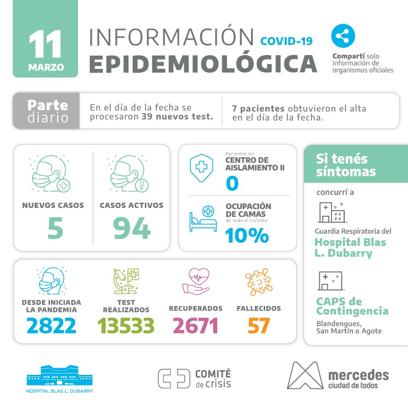 En la información epidemiológica oficial enviada por las autoridades locales, se confirma que 5 pacientes obtuvieron el resultado positivo de covid-19 entre los 39 análisis procesados en el día de la fecha. Además, informaron que son siete los pacientes que obtuvieron el alta en la jornada del día de hoy.