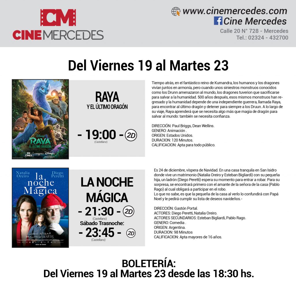 En su segunda semana de apertura, luego de un año de estar cerrado por la pandemia, el Cine Mercedes ofrece desde el viernes 19 hasta el martes 23 de marzo dos películas. Para los más pequeños, continúa la película animada «Raya y el Último Dragón». En tanto, para los más grandes se presenta una de las películas argentina de reciente estreno: «La Noche Mágica» protagonizada por Natalia Oreiro y Diego Peretti. Cabe recordar que por protocolo, la sala de cine local está funcionando al 30% de su capacidad, por lo tanto, es recomensable anticipar la compra de entradas.