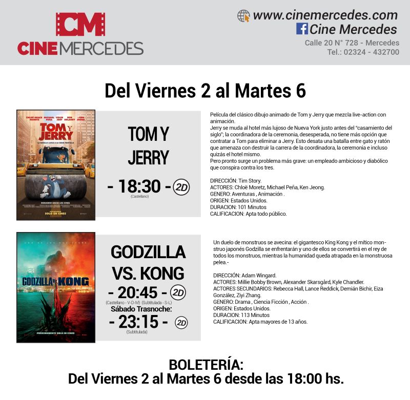 El Cine Mercedes presenta dos películas con personajes emblemáticos en para la pantalla grande y chica. Desde el viernes 2 hasta el martes 6 de abril, Tom y Jerry sigue en la función de las 18:30, mientras que a la hora 20:45 y el sábado trasnoche (23:15 hs) Godzilla se enfrenta a King Kong, un duelo de mostruos.