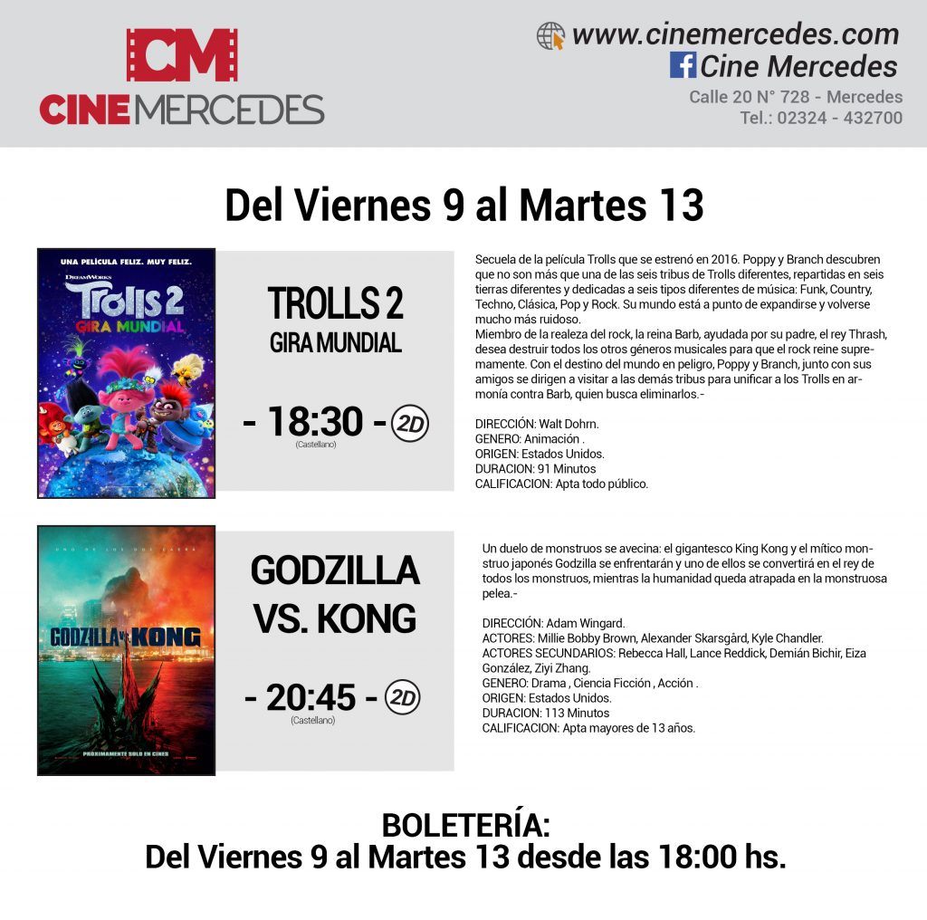 Desde el viernes 9 al martes 13 de abril, el Cine Mercedes continúa con la proyección del duelo de los monstruos. Godzilla vs Kong se proyectará en la función de las 20:45 horas. En tanto, para los más pequeños llega la segunda parte de Trolls. La función de la película de animación es a las 18:30. Se recuerda que el cine local está funcionando con ingreso limitado motivado por las condiciones pandémicas, por eso se recomienda anticipar la compra de entradas.