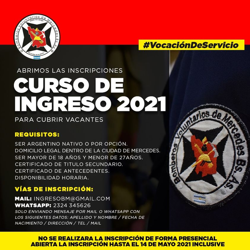 El cuerpo de Bomberos Voluntarios de Mercedes abrió su inscripción para el curso de ingreso 2021 para cubrir vacantes en el cuerpo activo. Es para personas entre 18 y 27 años, con residencia en Mercedes. La inscripción se realiza enviando un correo electrónico o un mensaje de whatsapp con los datos personales. Hay tiempo hasta el 14 de mayo inclusive.