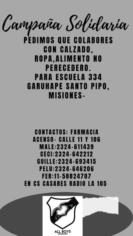 La nueva campaña de All Boys Solidario, con el apoyo de Gendarmería Nacional y la colaboración de alumnos de la Universidad del Siglo XXI, se llama «Que sigan caminando». En esta oportunidad colectana calzado, ropa, frazadas, y material deportivo que será destinado a los niños de Santo Pipo y Garuhape Misiones.
