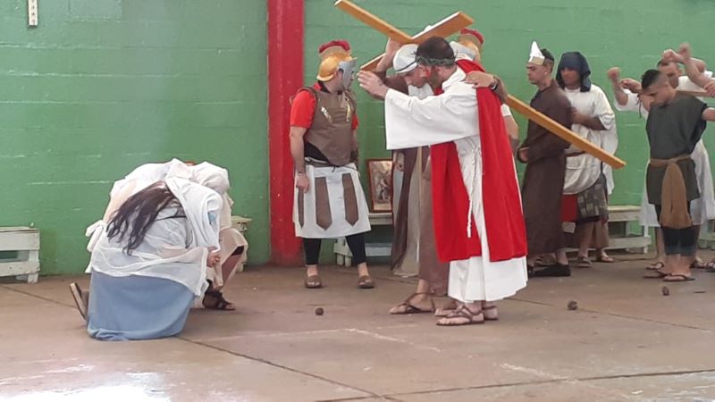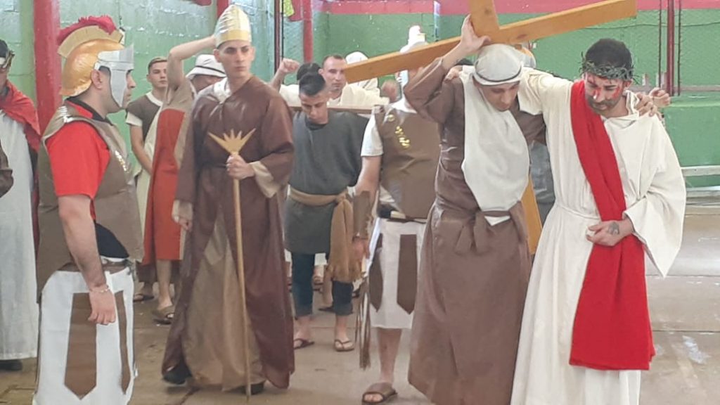 El viernes pasado en el SUM de la Unidad Penitenciaria N° 5 de Mercedes, doce internos y tres internas del Pabellón Literario presentaron el Vía Crucis en todas sus estaciones. Este tipo de actividades posibilita que los internos e internas que presan la fé católica tengan un acercamiento a la vida y obra de Jesús además de mantener el cuerpo y la mente ocupada en espacios de intercambio e integración mutua.