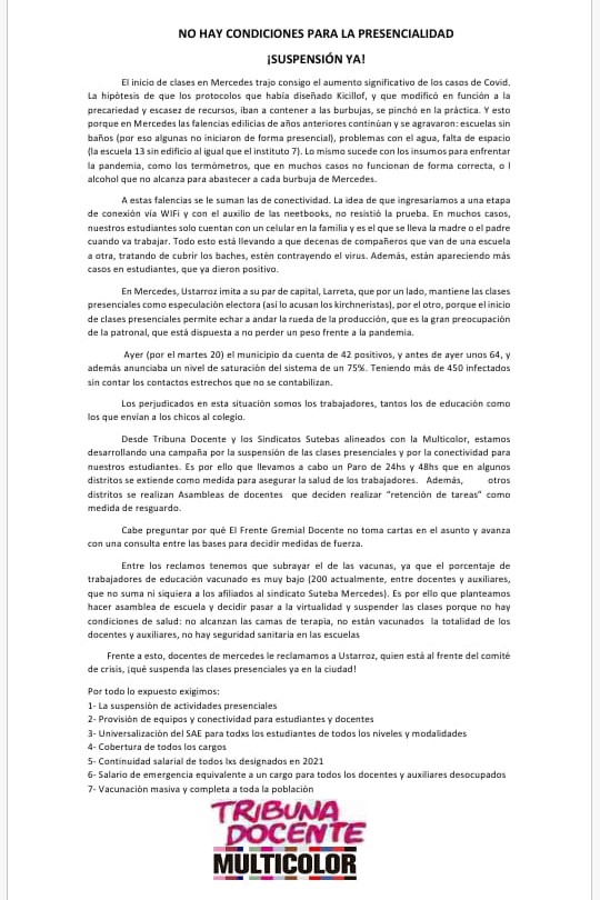 A través de una comunicación enviada a los medios, Tribuna Docente Mercedes, expresa su opinión acerca de la presencialidad de las clases en los diferentes niveles educativos. Es así que piden la suspensión de la actividad presencial, la provisión de equipo y conectividad para docentes y alumnos, la universalización del servicio alimentario educativo, entre otros temas.